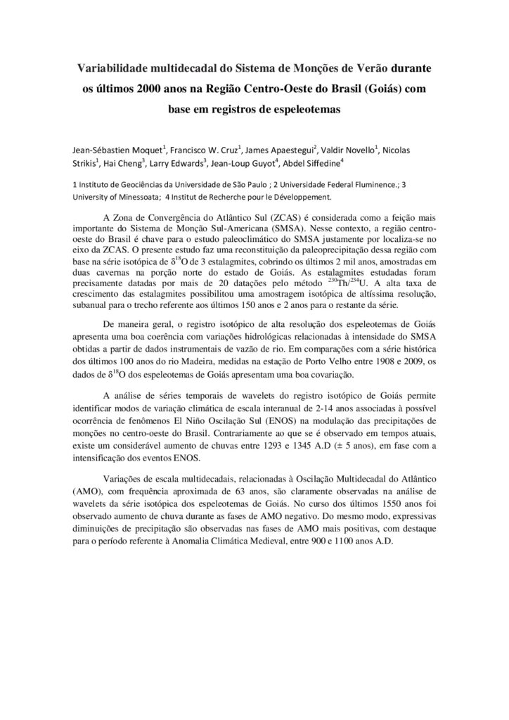 Moquet J.S., Cruz F., Apaestegui J., Novello V., Strikis N., Cheng H., Edwards R.L., Guyot J.L. and Sifeddine A. (2013). Variabilidade multidecadal do Sistema de Monções de Verão durante os últimos 2000 anos na Região Centro-Oeste do Brasil (Goiás) com base em registros de espeleotemas. 14to Congresso da Associação Brasileira de Estudos do Quaternário, 08/2013, Natal (Brésil). [lien]