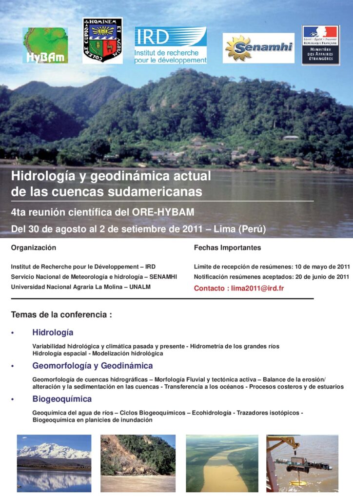 Apaestegui J., Cruz F., Guyot J.L., Sifeddine A., Santos R., Mancini L., Auler A., Ronchail J., Sondag F. (2011). Variabilidad del Monzón Sudamericano durante los últimos 1000 años inferidos a partir de estudios isotópicos en espeleotemas recolectados en los Andes orientales del Peru y Bolivia. 4ta Reunión Científica HYBAM – Hidrología y geodinámica actual de las cuencas sudamericanas, HYBAM, 09/2011, Lima (Pérou). [lien]