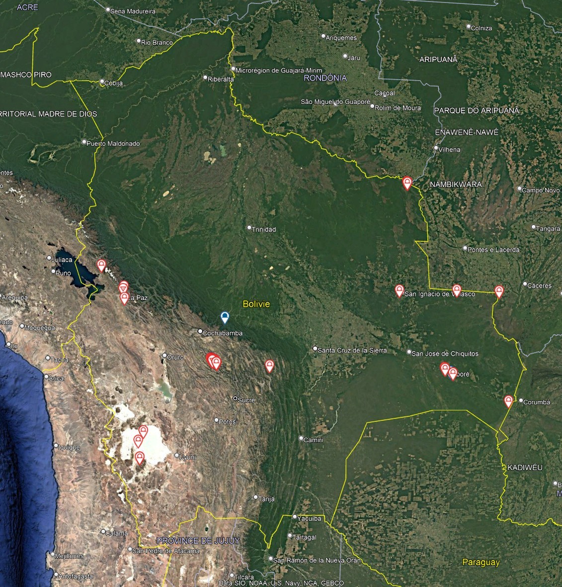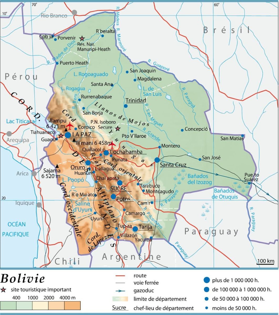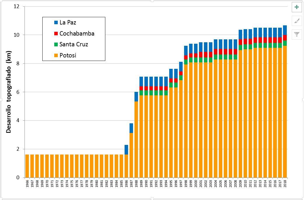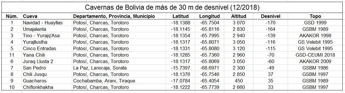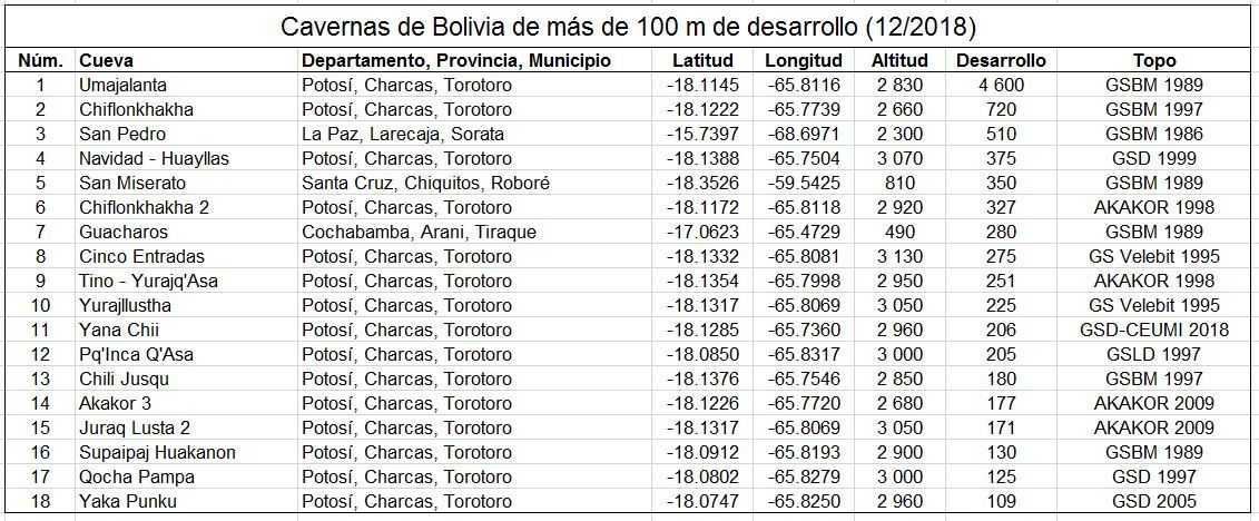 A ce jour, 83 cavités ont été recensées dans le pays, totalisant 11.2 km de galeries topographiées, dont 84% sont situées dans le département de Potosí. Aujourd’hui, les trois cavernes les plus longues sont la Caverne de Umajalanta (4.6 km) et la Résurgence de Chiflonkhakha (0.7 km) à Torotoro (Charcas, Potosi), et la Cueva de San Pedro (0.5 km) à Sorata (Larecaja, La Paz). Les trois cavités les plus profondes sont la Cueva de la Navidad (-170 m), la Cueva Tino (-150 m), et la Caverne de Umajalanta (-144 m), toutes situées à Torotoro (Charcas, Potosi).