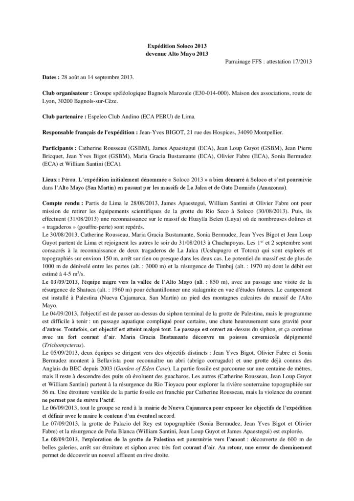 Bigot J.Y. (2013). Expédition Soloco 2013 devenue Alto Mayo 2013. CR CREI-FFS, Bagnols-sur-Cèze (FR), 2 p. [lien]