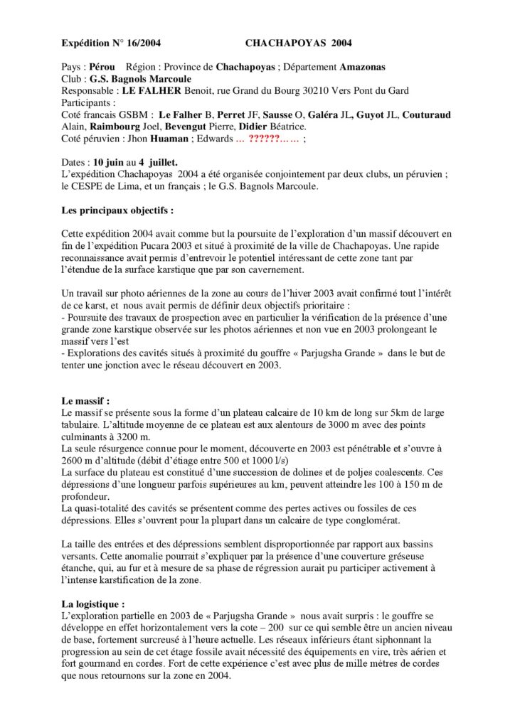 Le Fahler B. (2004). Chachapoyas 2004. CR CREI-FFS, Bagnols-sur-Cèze (FR), 2 p. [lien]