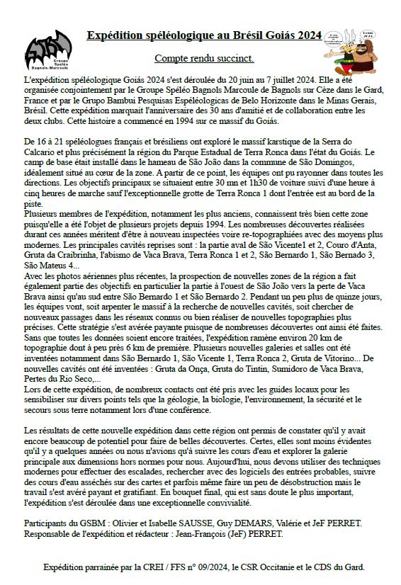 Perret J.F. (2024). Expédition spéléologique au Brésil, Goiás 2024. CR CREI-FFS, Bagnols-sur-Cèze (FR), 2 p. [lien]