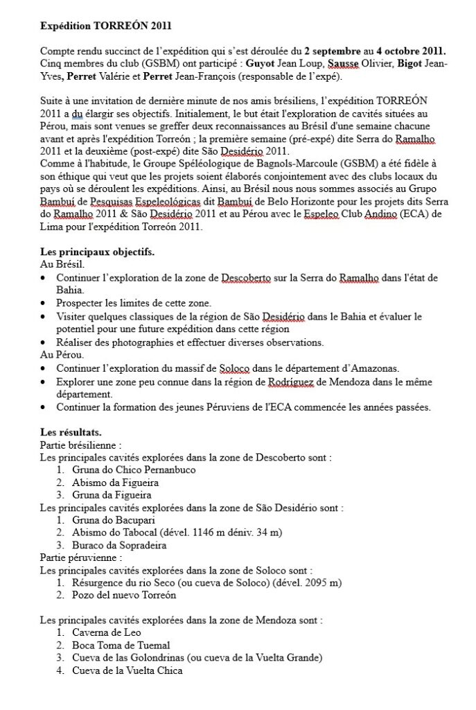 Perret J.F. (2011). Expédition Torreón 2011 (Brésil). CR CREI-FFS, Bagnols-sur-Cèze (FR), 2 p. [lien]