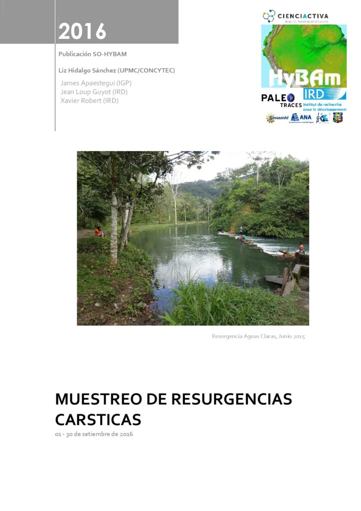 Hidalgo L., Apaéstegui J., Guyot J.L., Robert X. (2016). Muestreo de resurgencias cársticas (09/2016). CR HYBAM-PALEOTRACES, Lima (PE), 6 p. [lien]