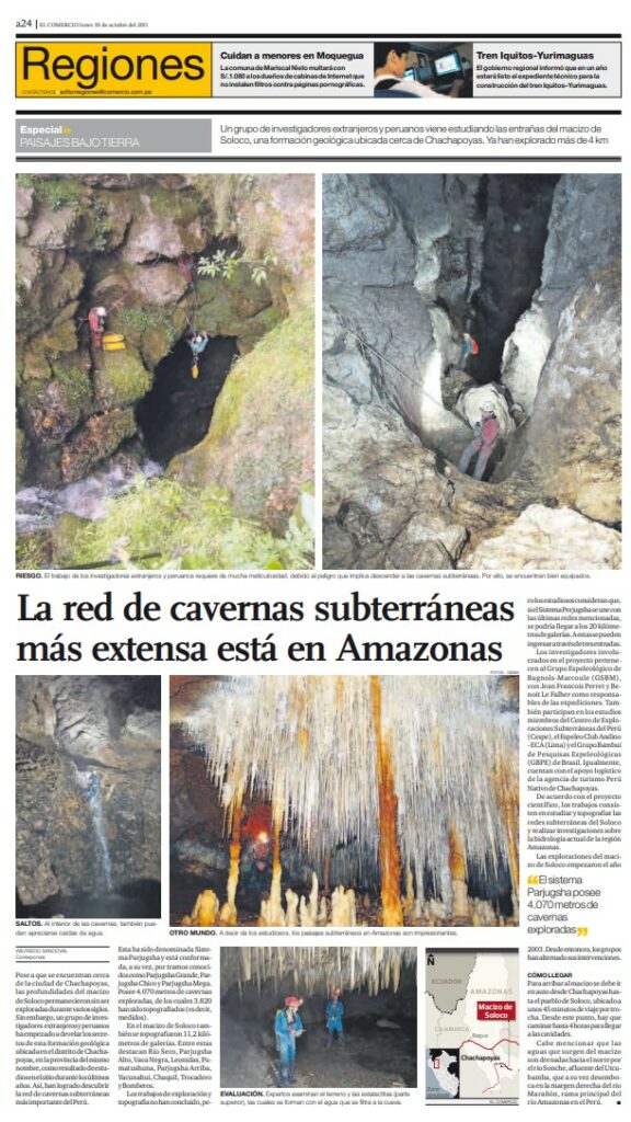 Sandoval W. (2011). La red de cavernas subterráneas más extensa está en Amazonas. El Comercio, Lima (Pérou), 10/10/2011: a24. [lien]
