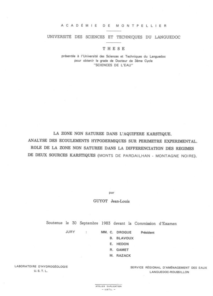 Guyot J.L. (1983). La zone non saturée dans l’aquifère karstique. Analyse des écoulements hypodermiques sur périmètre expérimental. Rôle de la zone non saturée dans la différenciation des régimes de deux sources karstiques (Monts de Pardailhan, Montagne Noire). Doctorat de 3ème cycle, Université de Montpellier 2, Montpellier (France), 229 p. [lien]