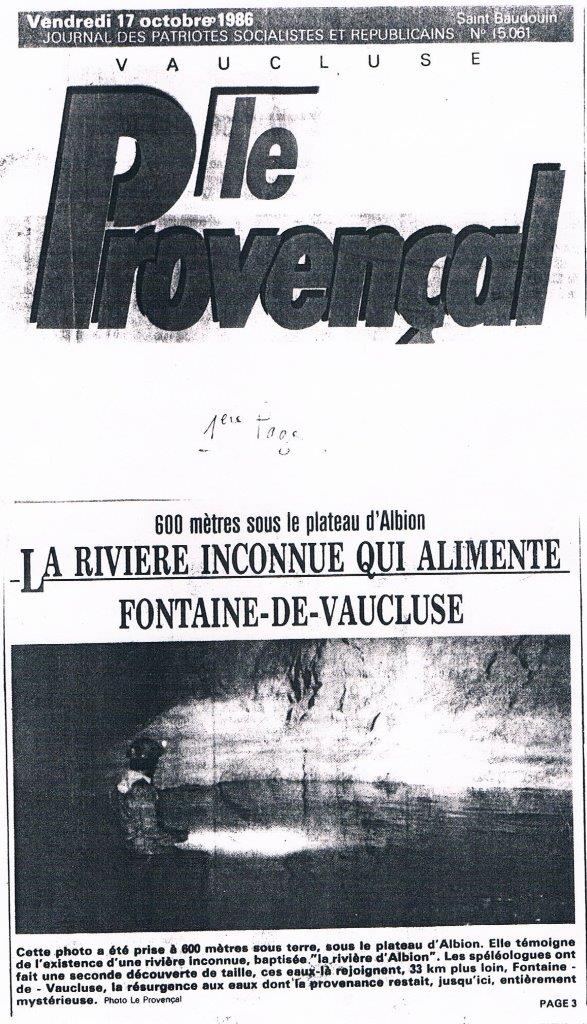Maniaci A. (1986). Double découverte 600 mètres sous terre. La rivière Albion alimente Fontaine de Vaucluse. Le Provençal, 17/10/1986. [lien] – Archives Jacques Sanna
