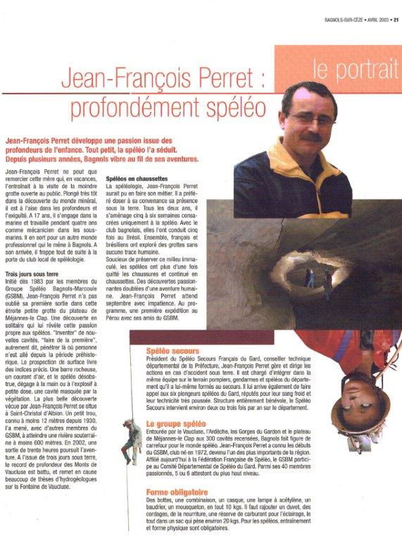 X. (2003). Jean-François Perret, profondément spéléo. Magazine de la ville de Bagnols-sur-Cèze, 04/2003. [lien] – Archives Jacques Sanna
