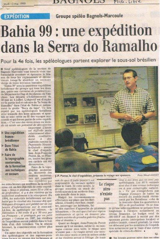 I.J. (1999). Bahia 99 : une expédition dans la Serra do Ramalho. Midi Libre, 13/05/1999. [lien] – Archives Jacques Sanna