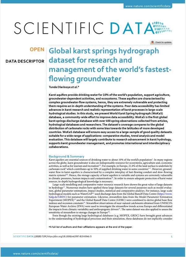 Olarinoye T., Gleeson T., Marx V., Seeger S., Adinehvand R., Allocca V., Andreo B., Apaestegui J., Apolit C., Arfib B., Auler A., Barbera J.A., Bechtel T., Binet S., Bittner D., Blatnik M., Bolger T., Charlier J.B., Chen Z., Chiogna G., Coxon G., De Vita P., Doummar J., Epting J., Fournier M., Goldscheider N., Guanghui J., Gunn J., Guo F., Guyot J.L., Hidalgo L., Howden N., Huggenberger P., Hunt B., Jeannin P.Y., Jones G., Jourde H., Karmann I., Koit O., Ladouche B., Serena Lizo I., Liu Z., Massei N., Mazzilli N., Mudarra M., Parise M., Pu J., Ravbar N., Santo A., Sivelle V., Skoglund R.O., Stevanovic Z., Wood C., Worthington S., Hartman A. (2020). Word karst spring hydrograph (WoKaS) database for research and management of the world’s fastest-flowing groundwater. Scientific Data, 7, 59. [lien]