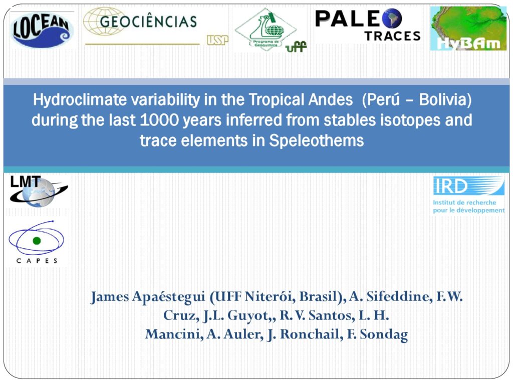 Apaéstegui J., Sifeddine A., Guyot J.L., da Cruz F., Strikis N. (2016). Reconstrucciones paleoclimáticas del último milenio en base a registros de la Cueva Palestina. 1ro Simposio internacional del Carst en Perú. 09/2016, Tarapoto (Pérou). [lien]