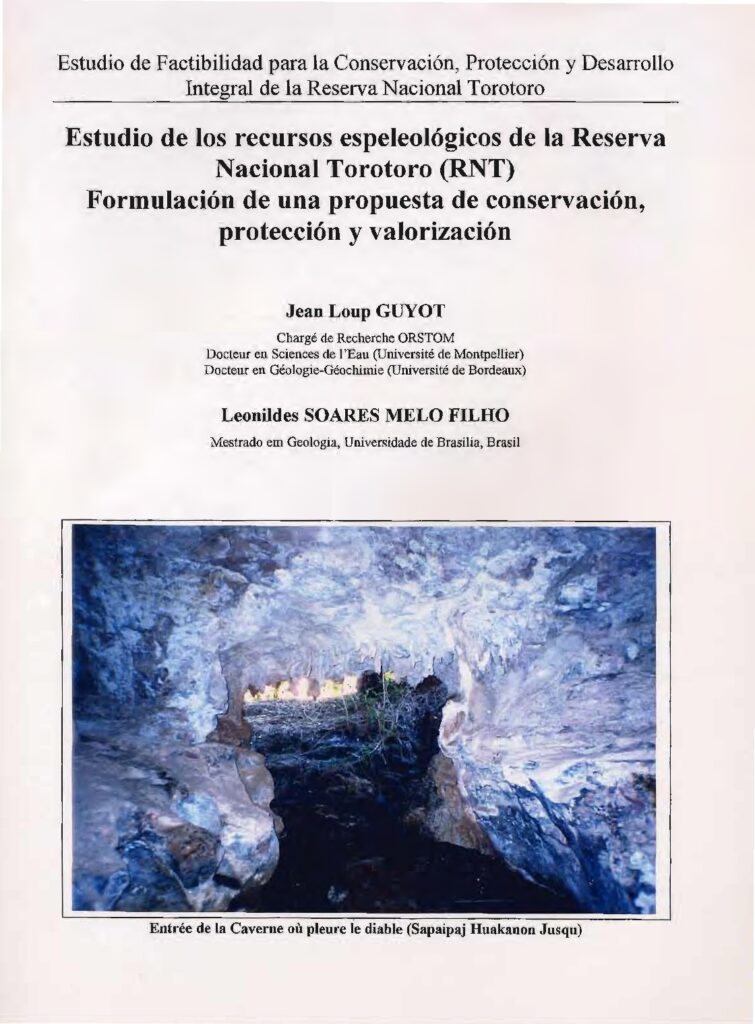 Guyot J.L., Soares Melo Filho L. (1997). Estudio de los recursos espeleológicos de la Reserva Nacional Torotoro (RNT). Formulación de una proposta de conservación, protección y valorización. CR ORSTOM-UnB, Cochabamba (BO), 46 p. [lien]